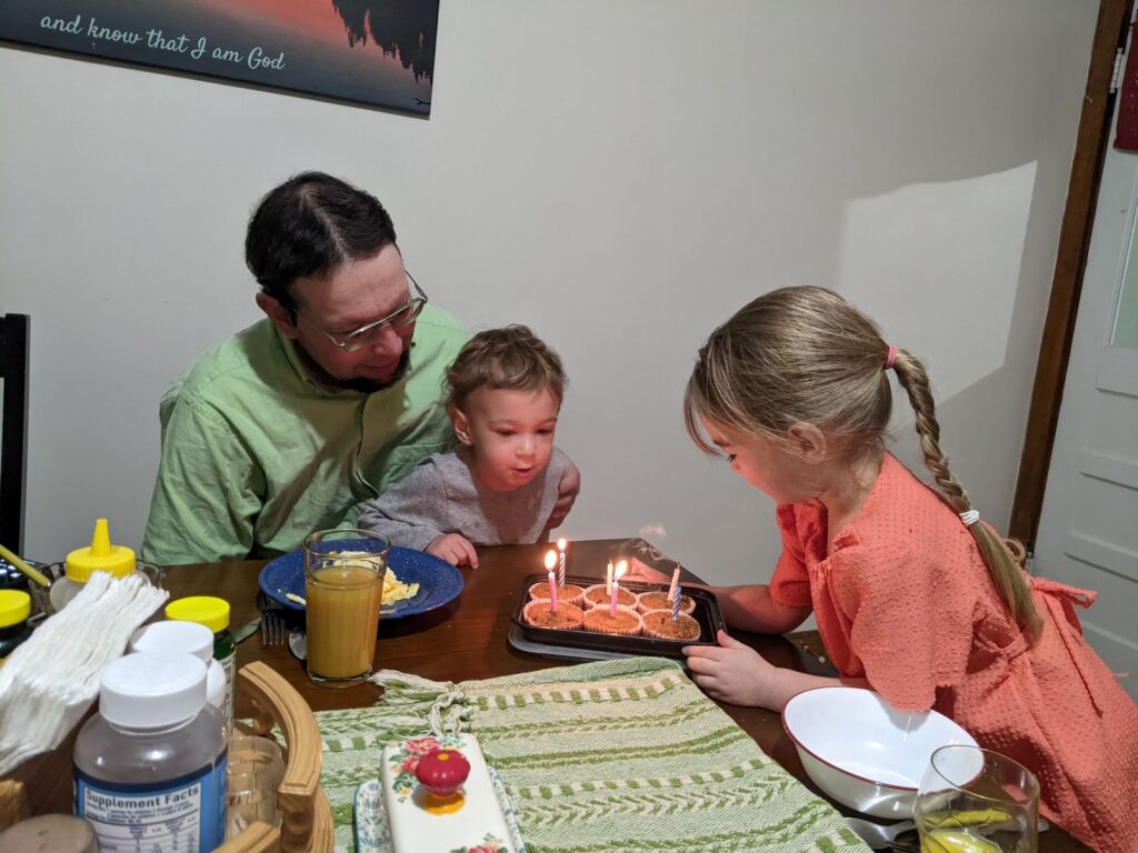 Finally, here is a favorite memory from Christmas–singing “Happy Birthday” to Jesus over muffins at breakfast. I read the idea somewhere (in Focus on the Family magazine, I think), and of course children love things like that. A small way to help them get what Christmas is truly about.