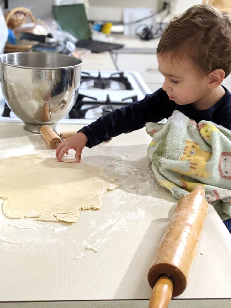 Here is Teddy helping me make pie dough while clutching his blankie: